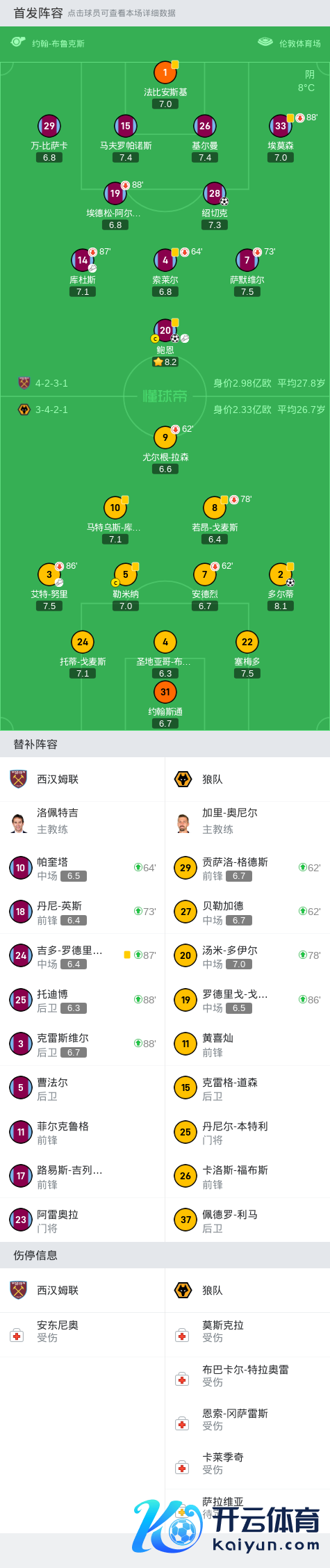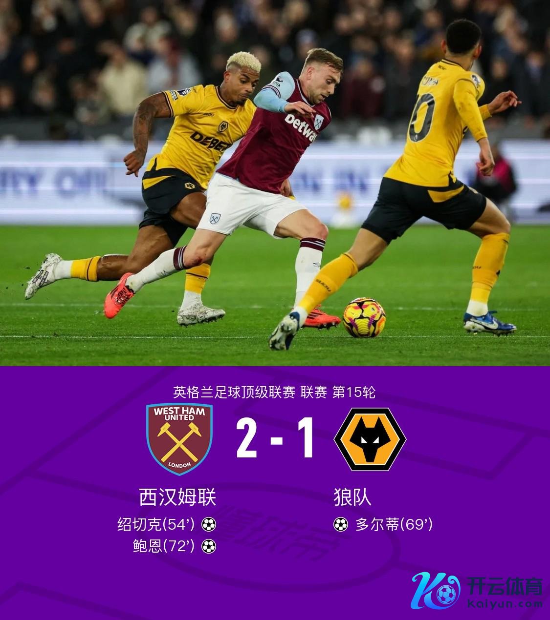 在英格兰足球顶级联赛第15轮的较量中,西汉姆联镇守主场迎战狼队。比赛中,西汉姆联的鲍恩推崇出色,他先是助攻见效破门,随后又接到库杜斯的传球,躬行攻入一球。狼队方面,多尔蒂在艾特-努里的助攻下也为球队打入一球。最终,西汉姆联以2-1的比分降服狼队,得回了本场比赛的见效。