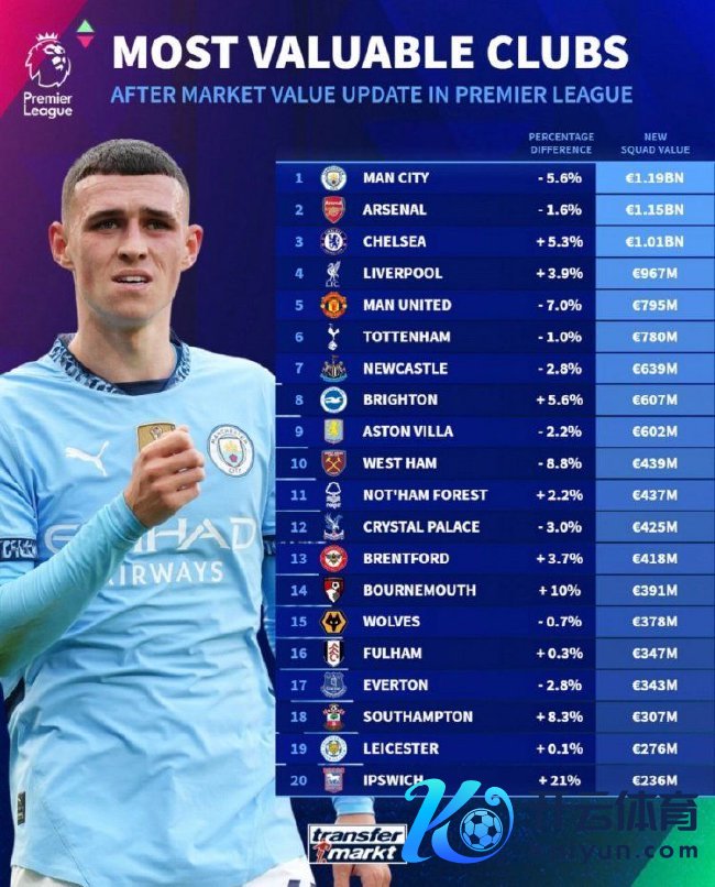 盛名数据网站转会市集更新了英超球员的身价,英超20支球队的最新身价榜单也随之出炉。