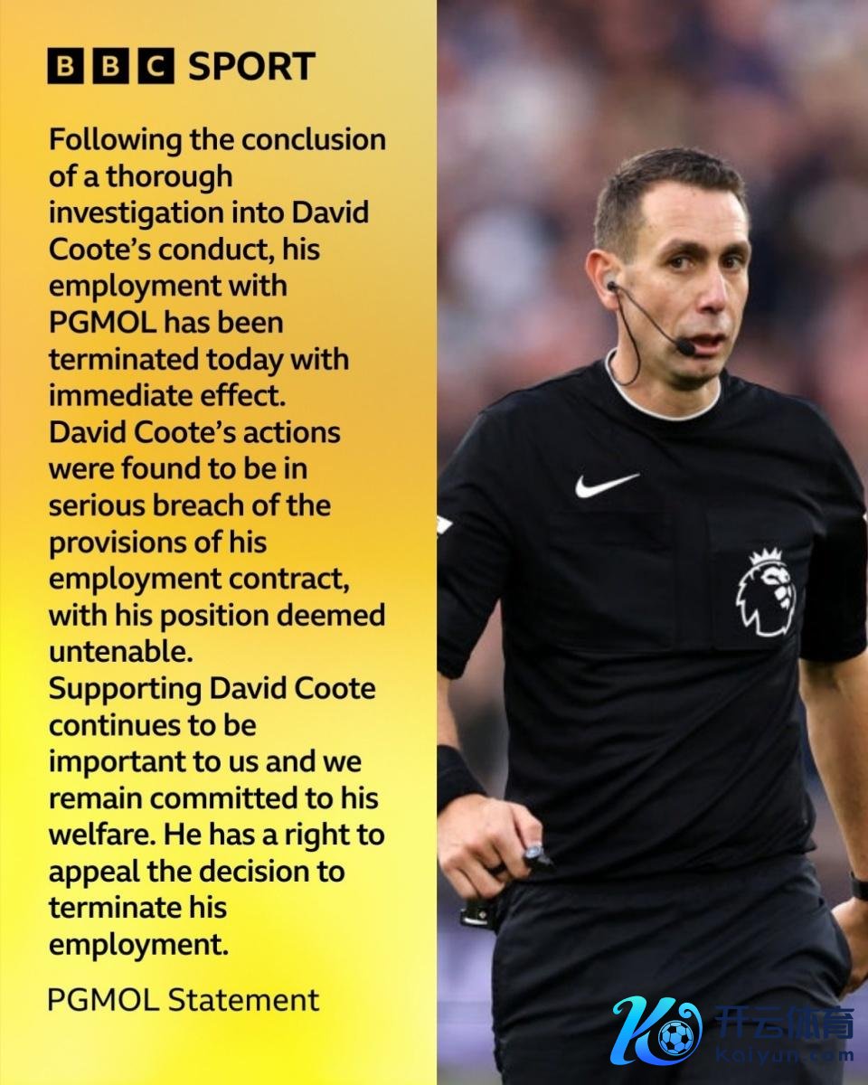 英超裁判公司官方文告,此前被曝出辱骂利物浦俱乐部和时任利物浦主帅克洛普的裁判大卫-库特,被立即打消工作左券。
