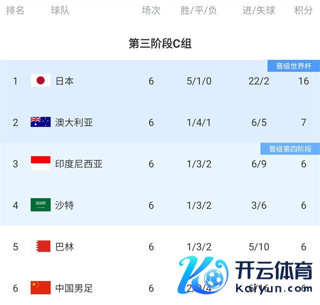 世初赛亚洲区第三阶段,中国队场地的C组如故遏抑了总共第六轮的比赛,中国队得益一好一坏音信:好音信是2至6名同积6分齐很弱,坏音信则是国足新净胜球亏欠暂时垫底。