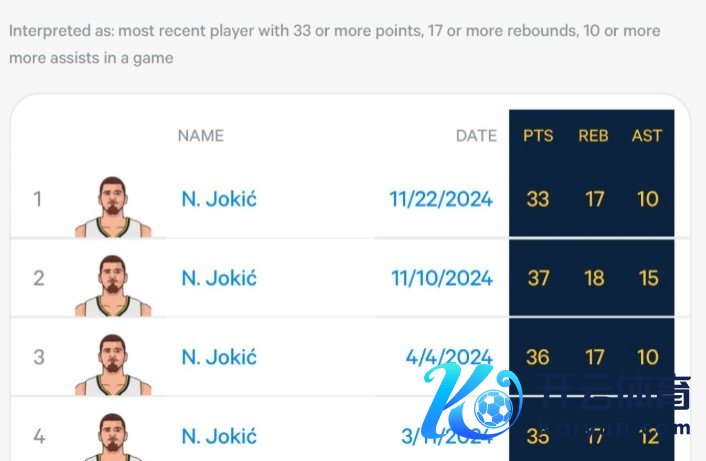据统计,定约最近的四次单场至少33分17板10助的数据齐来自于约基奇,但这四场比赛,掘金是2胜2负。