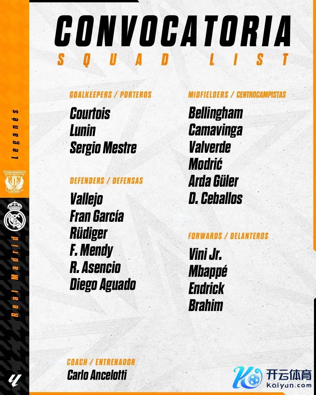 安切洛蒂不得不乞助于后生队主帅阿贝罗亚,意大利东说念主将他麾下的17岁小将Diego Aguado列入本场大名单,一都入选的还有21岁的Raul Asencio。土耳其中场居莱尔在伯纳乌球场的改日成疑,得不到太多契机的他成为阿森纳的补强对象,罗马和巴利亚多利德也对球员十分感风趣。姆巴佩本次外洋比赛日莫得入选法国队,他依然遭逢了四场进球荒。皇家马德里在已往的两次客场交锋均和莱加内斯战平。