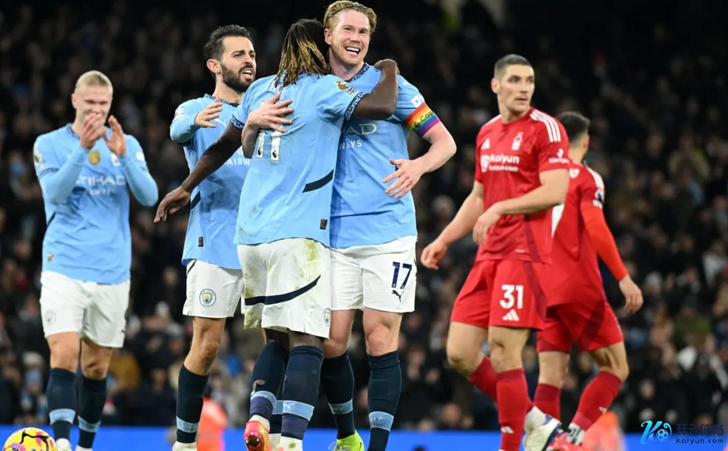 上半场,曼城控球率67%,9次射门4次打正,创造4次得分契机把抓住2次,诺丁汉丛林8次射门2次打正。开场第8分钟,京多安传中,德布劳内头球攻门,B席门前包抄破门,曼城1-0赢得虚幻开局,随后第21分钟,哈兰德直塞,格瓦迪奥尔单刀契机射门打偏,第30分钟,伍德抢断单刀契机一样打偏。第31分钟,多库助攻德布劳内抽射破门,曼城2-0再下一城。