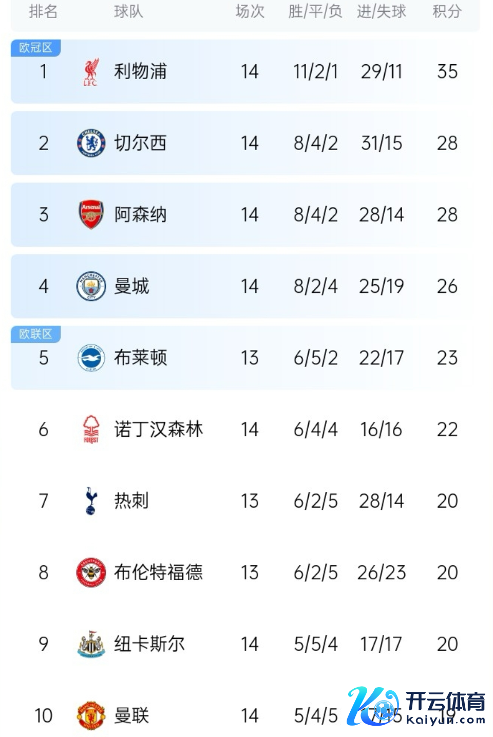 接下来望望各队最新积分榜排行情况:利物浦积35分坐稳第一,不外领跑上风被收缩到7分;切尔西积28分升至第二,阿森纳积28分跌至第三;曼城积26分攀升第四,争冠悬念又转头了。